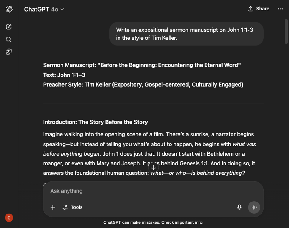 Iâve experimented extensively with using an AI for sermon preparation. My first experiments were simplistic: âWrite an expositional sermon manuscript on John 1:1â3 in the style of Tim Keller.â