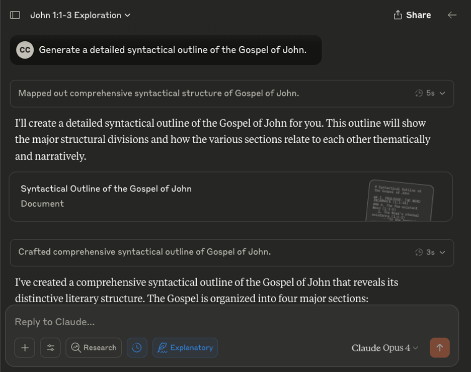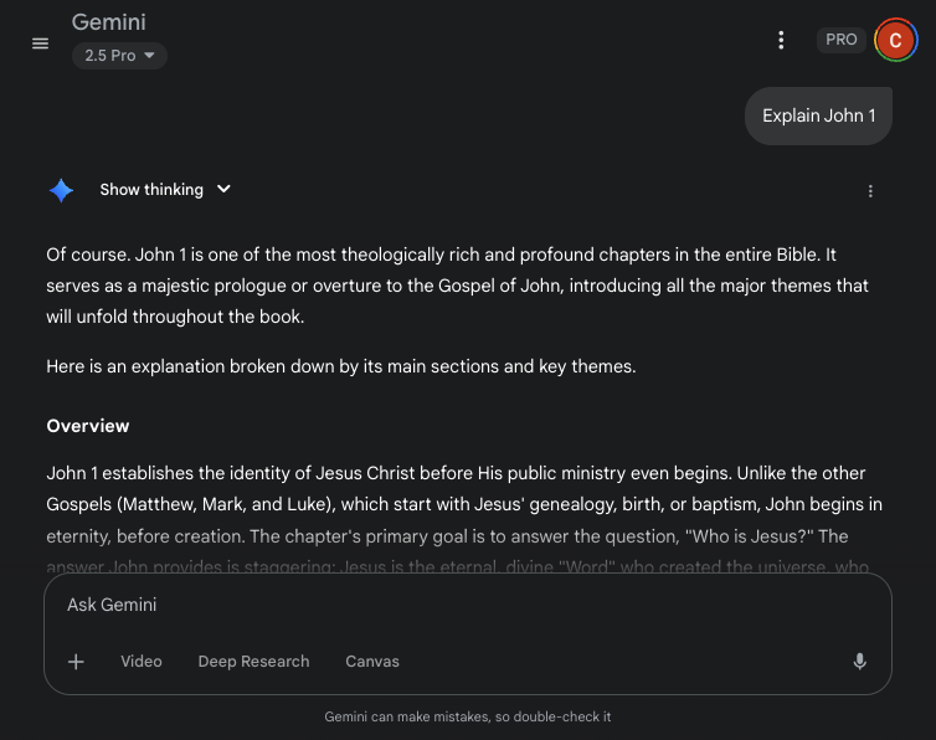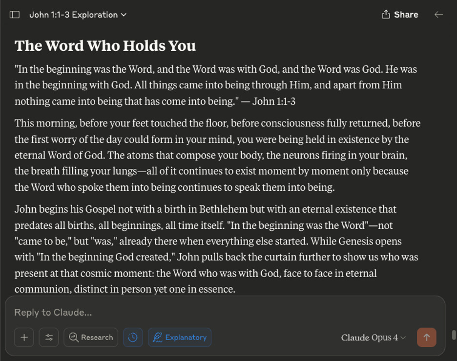 This leads to my current use of AI platforms, which is far more modest and practical. A few years ago, my daily Bible study was an unhurried, multihour affair of mining insights, writing in notebooks, and slowly working through lexicons. Now that I have a 2-year-old, a 1-year-old, and a business to run, that luxury has evaporated. My devotional time is more focused. Iâll read a passage like John 1, meditate on it, and then turn to an AI with a simple prompt: âExplain John 1.â