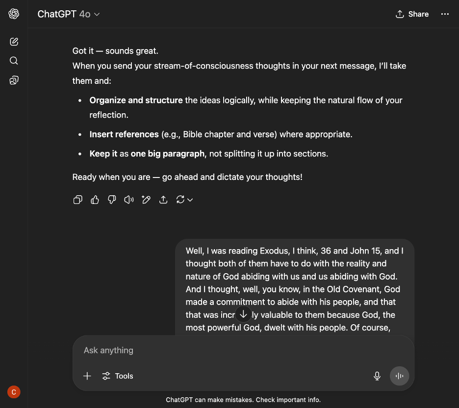 Talking out your sermon ideas to an AI and having it instantly transcribe them is a powerful way to get started. Just ignore its sycophantic feedback (âThatâs a brilliant insight!â) and use the text as your raw material.