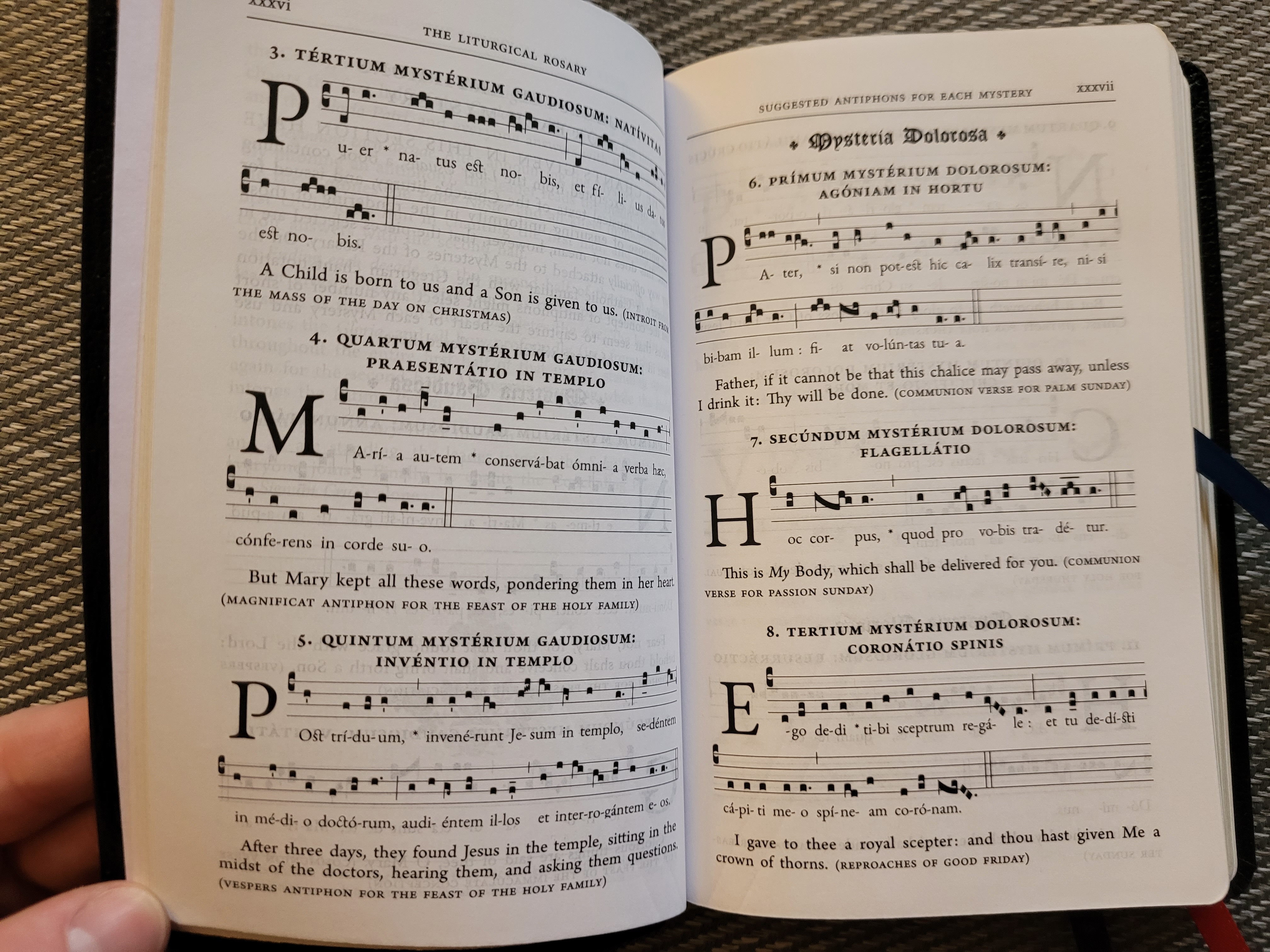 In addition to these texts, which make up the greater part of the book, there is one set of extended meditations for each mystery, as well as a set of 15 Gregorian chant antiphons to sing.